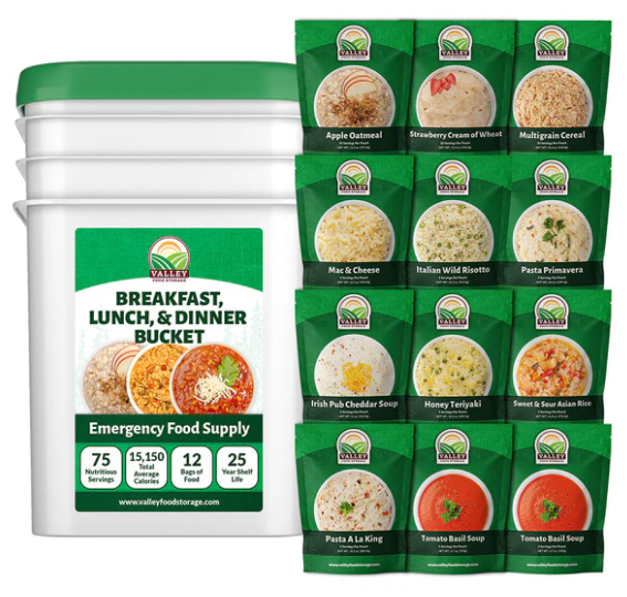 The Valley Food Storage Breakfast, Lunch & Dinner Bucket contains 8 of our most popular entrées and 4 of our best-selling breakfasts for a combined 75 servings of hearty and great-tasting survival food. Grow your current long-term food storage or use this as a starting point to build your emergency food stash.