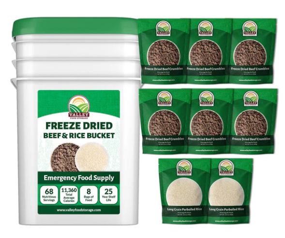 With 6 bags of freeze-dried Beef and 2 bags of densely packed high-quality long-grain rice our chicken and rice bucket will become a staple in your food storage.