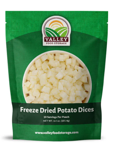 Valley Food StorageFreeze Dried Potato Dices, are one of the most versatile foods we have and should be a staple in your kitchen and in your long term food storage. Add them to various recipes or your stock for additional strength provided by the Vitamin C and Iron packed potatoes. Each pouch of freeze dried potatoes contains 10 servings.