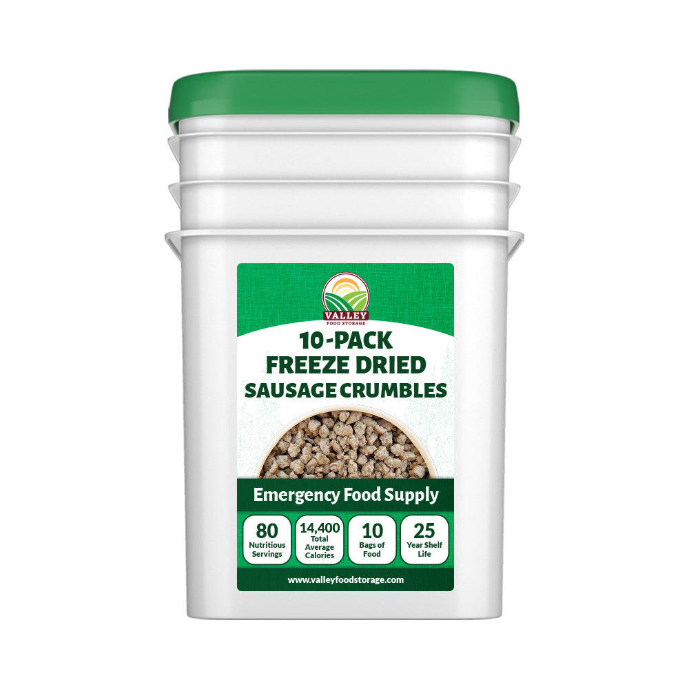 Order freeze dried sausage crumbles from the leader in simple emergency food, Valley Food Storage. Our dehydrated sausage crumbles are ready for quick rehydrate and then to be added to any meal for a quick protein and flavor boost. Order freeze dried sausage online from Valley Food Storage.