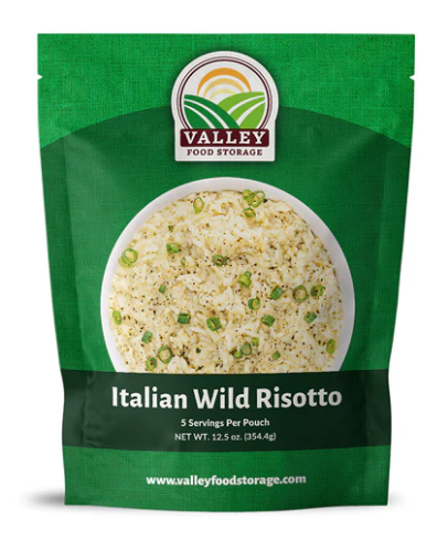 Valley Food Storage Italian Wild Risotto features a mild taste with parsley flakes added making it pair well with any freeze-dried protein and perfect for a quick and convenient lunch or dinner for the whole family. Each pouch of Italian wild risotto contains 5 servings.