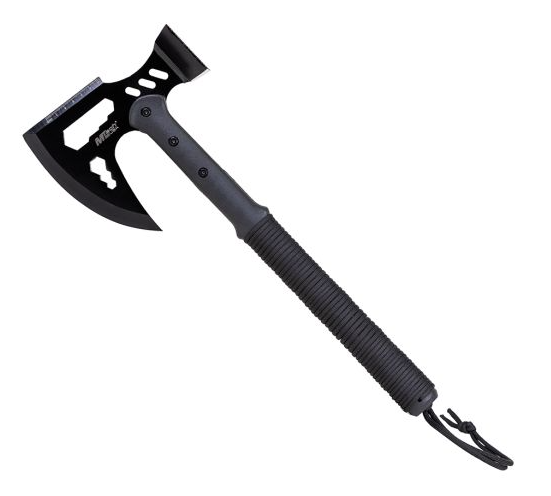 Built for strength and control, the MTech Tomahawk Axe has a 6.5" blade crafted from 3Cr13 stainless steel with a full-tang design for maximum durability. The black cord-wrapped handle provides a rugged grip, while the included lanyard adds convenience and security. Measuring 17.5" in total length, this tomahawk is ideal for chopping, breaching, or outdoor utility tasks. Perfect for survival kits, range days, or camp use.
