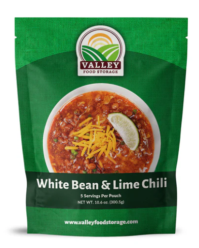 Valley Food StorageWhite Bean and Lime Chili features a thick and savory mild chili mixed with Great White Northern Beans, Pinto Beans, an assortment of vegetables and a hint of lime making it perfect for a quick and convenient lunch or dinner for the whole family. Each pouch of white bean & lime chili contains 5 servings.